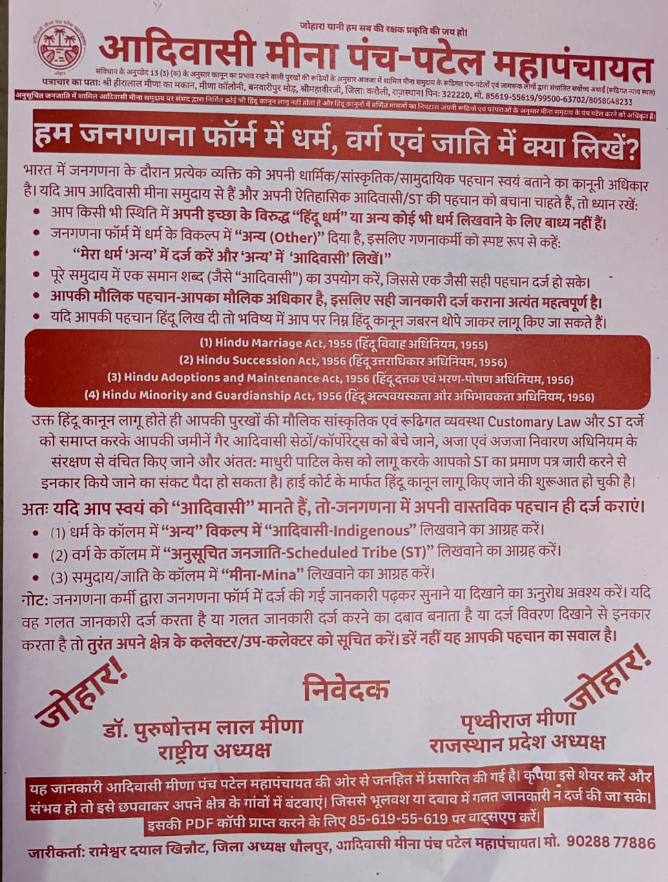 “अपनी पहचान खुद लिखवाएं — आदिवासी मीणा की असली पहचान जनगणना में दर्ज हो, यही हमारा अधिकार है।”